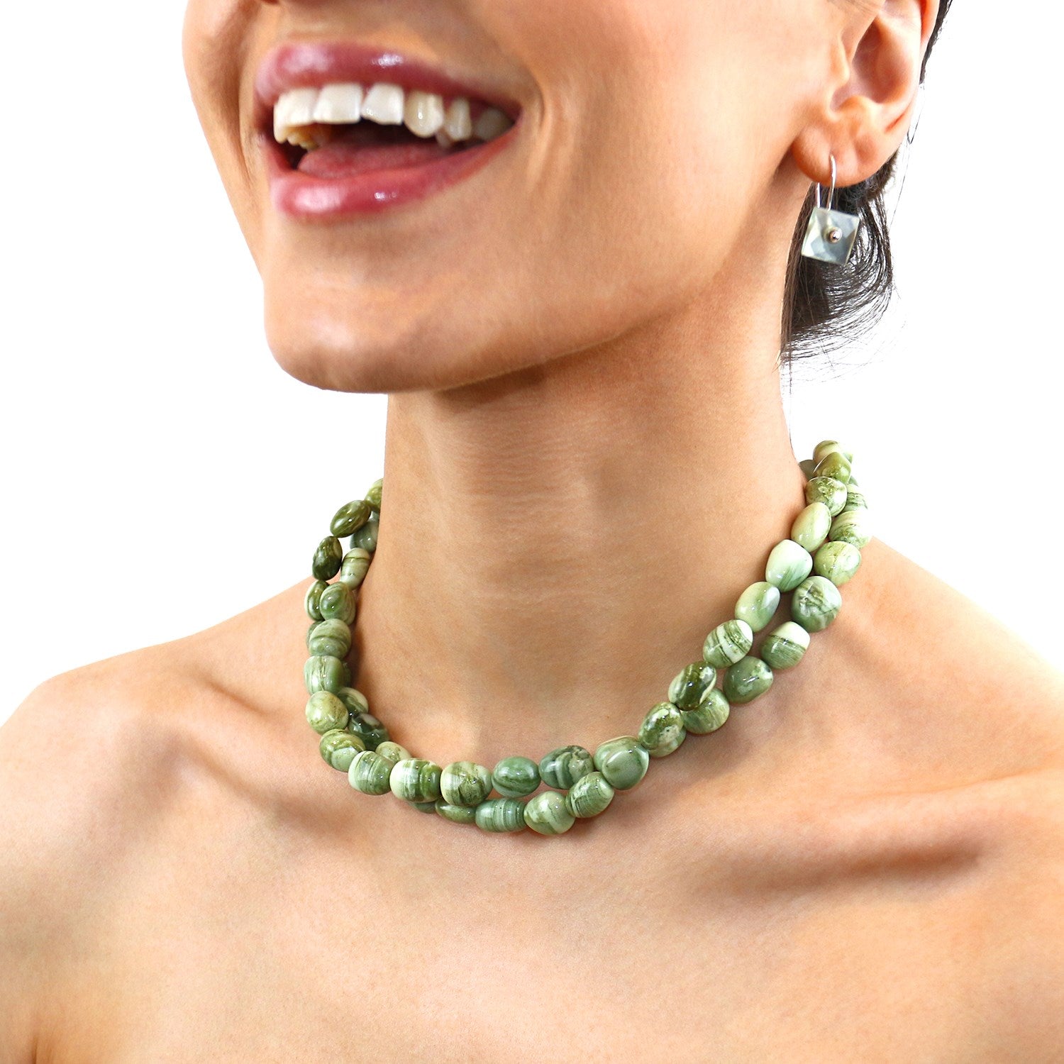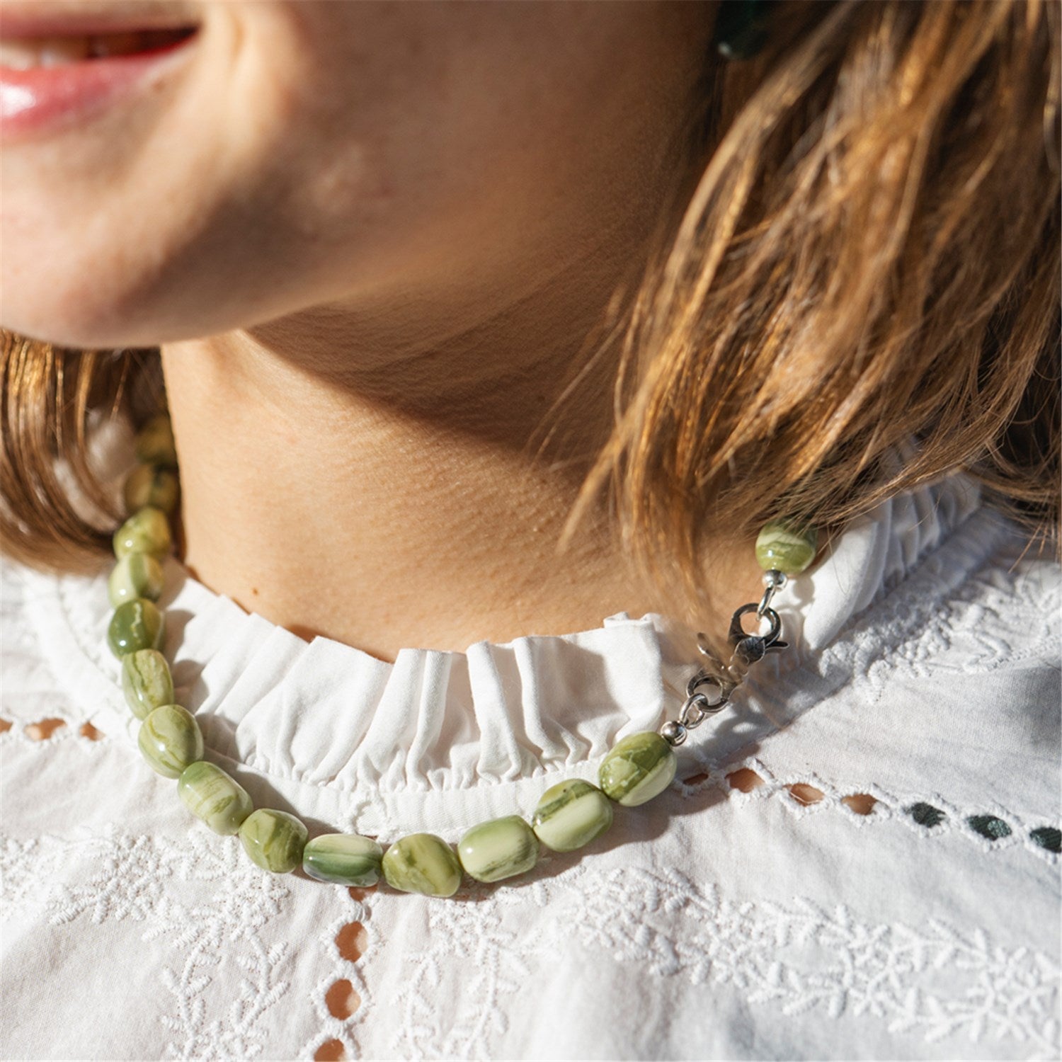 The gemstone appears in soft shades of green and yellow. Natural variations in colour and pattern make each stone unique, giving the necklace its own personal expression.