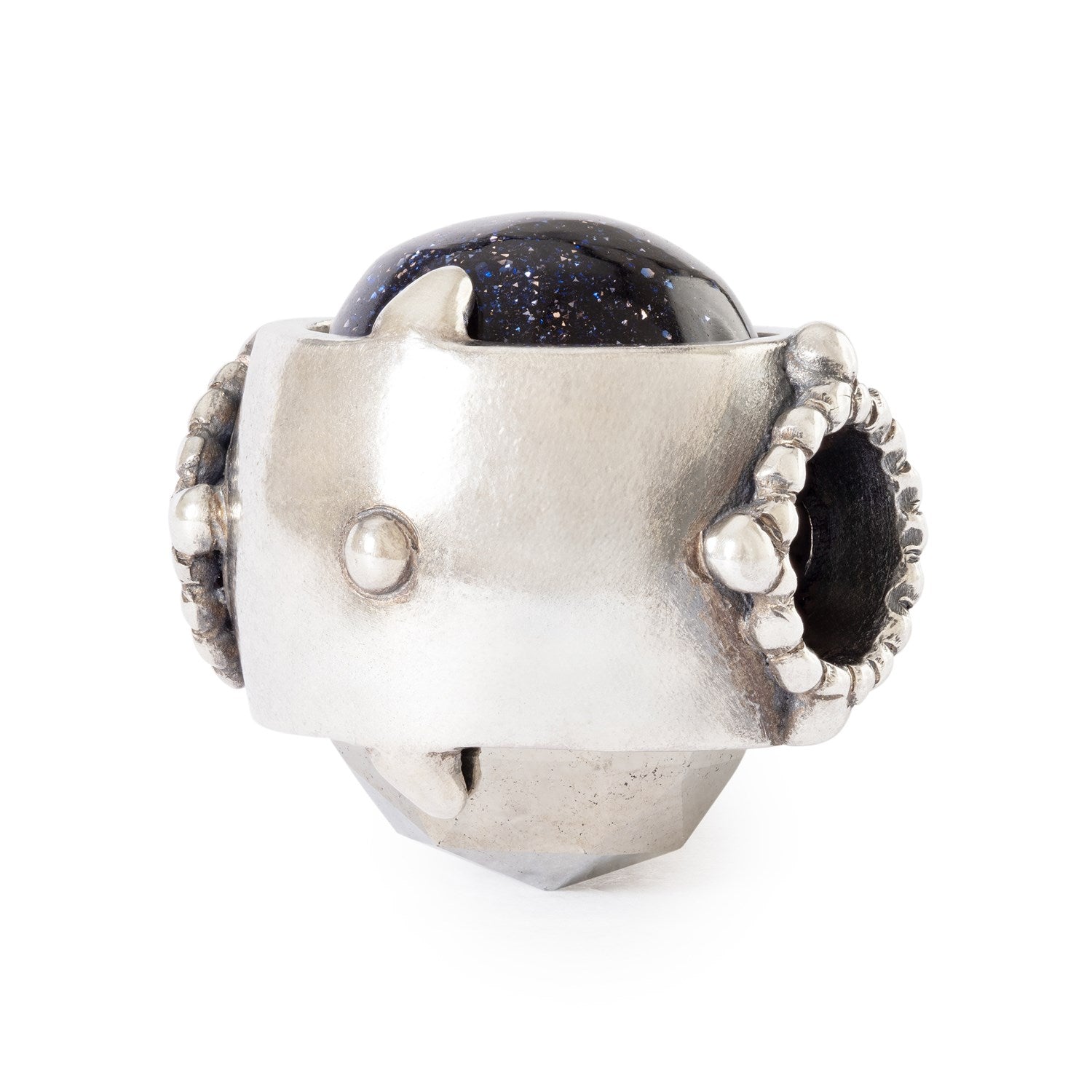 This sculptural bead is crafted in sterling silver and holds two stones in balance. Pyrite offers strength and protection while blue goldstone brings calm and clarity. Designed to fit bracelets, bangles and necklaces, it becomes a personal talisman to carry with you.